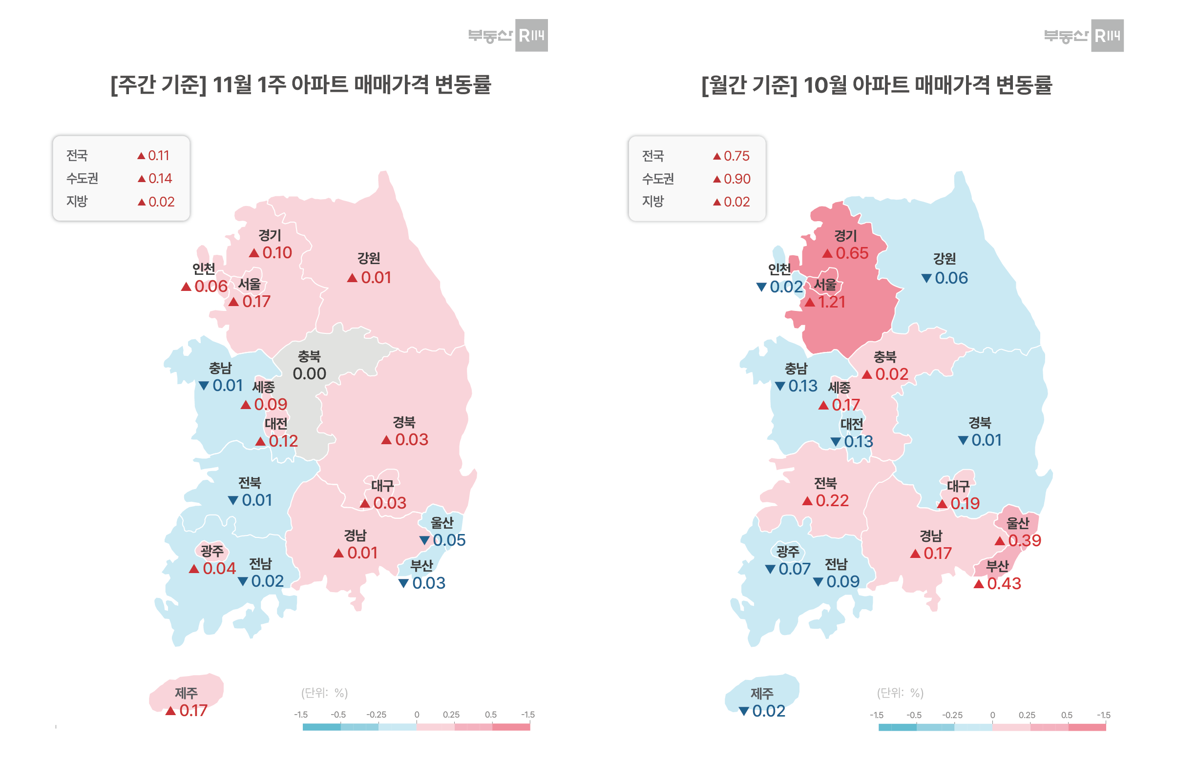 매매 - 전국 0.25%, 서울 0.42%, 수도권 0.30%, 5대광역시 0.10% 전세 - 전국 0.11%, 서울 0.18%, 수도권 0.13%, 5대광역시 0.05% ▣ 주간 매매가격 동향 부동산R114 (www.r114.com)에 따르면 10월 마지막 주(27~31일) 전국 아파..
